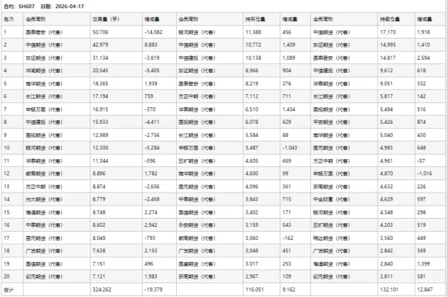 4月17日SH2607合约开盘价:2097,最高价:2097,最低价:2054,持仓量:179551,结算价:2076,昨结算:2092,跌:16,收盘价:2075,日成交量:236828手,沉淀资金17.88亿,资金流入:1.73亿。