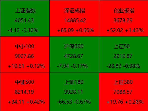 今日 A 股市场呈现出鲜明的结构性分化行情,主要指数涨跌互现,风格轮动特征显著。上证指数收盘报 4051.43 点,微跌 0.10%,盘中震荡幅度有限;深证成指表现明显占优,收盘 14885.42 点,上涨 0.60%,与沪指形成明显分化。