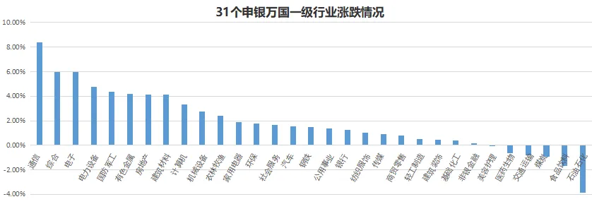 近五个交易日31个申万一级行业板块全部上涨。其中通信、综合、电子涨幅居前,石油石化、食品饮料、煤炭跌幅居前。