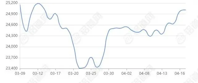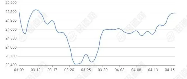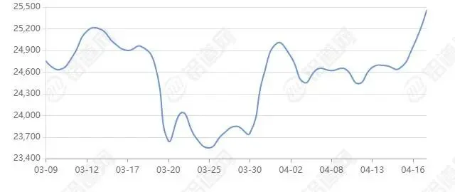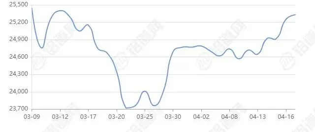 2026年04月17日上海期货行情价25450涨跌+210,最低25260,最高25600,前三日均价24763,前五日均价24679。