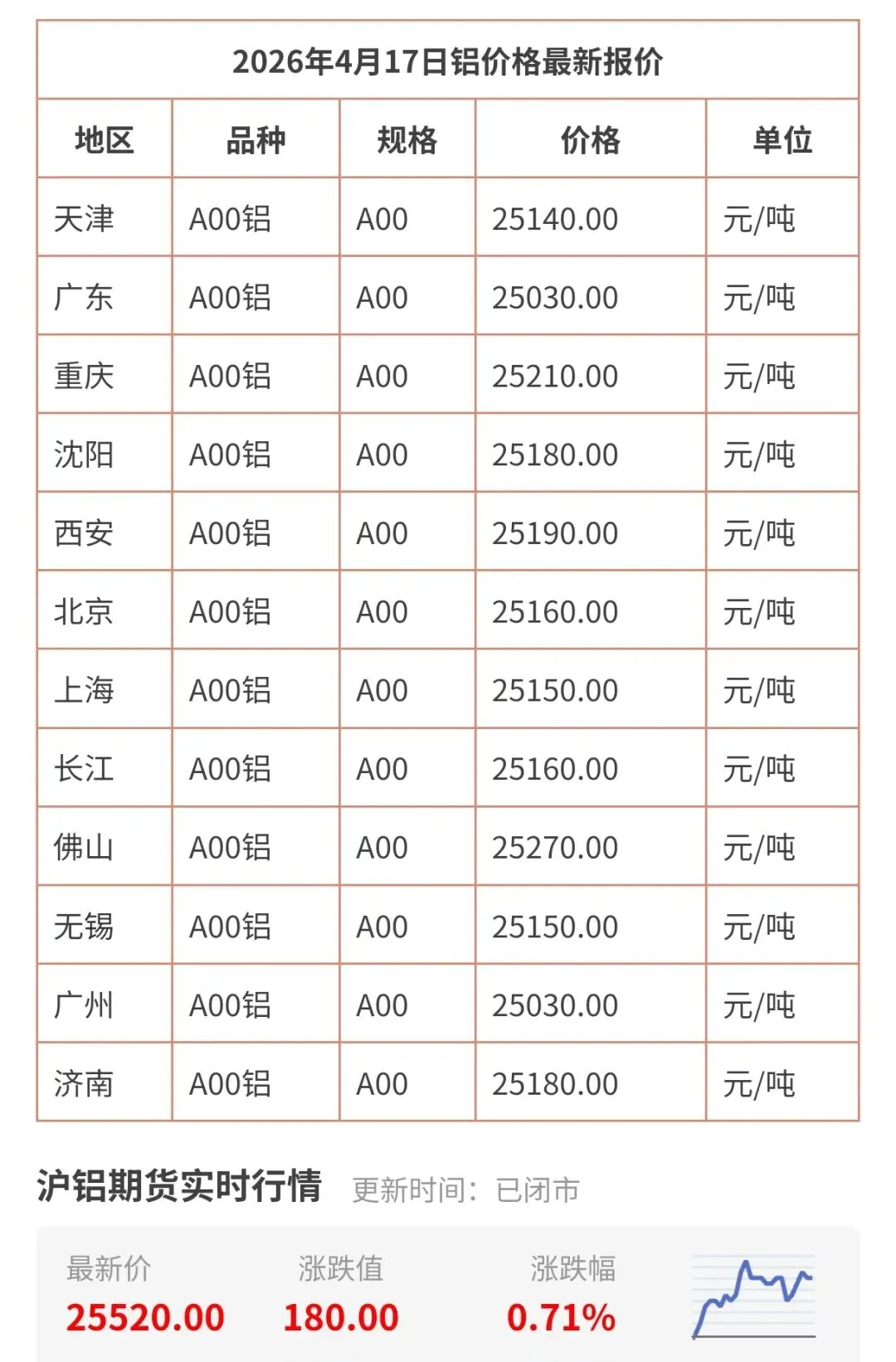 今天4月17日更新,今日铝价行情查询,包括天津、广州、上海、北京、无锡、广东、佛山等地区铝现货价格!长江有色铝锭最新价格是多少钱一公斤一览表