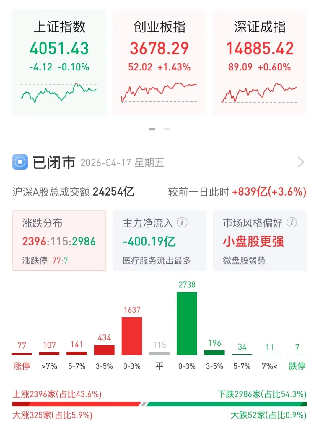 · 个股涨跌:2396只上涨,2986只下跌,赚钱效应一般,但创业板情绪高涨