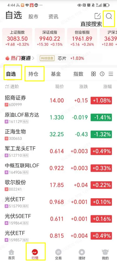 二,来到APP底部的【行情】页面,会出现一个【自选/持仓】的栏目,如果你有自己心仪的自选股或已经买了的持仓股,这里就会出现他们当下的股价和涨跌幅等情况,点进去可以去到和上面一样的个股详细行情页面了。