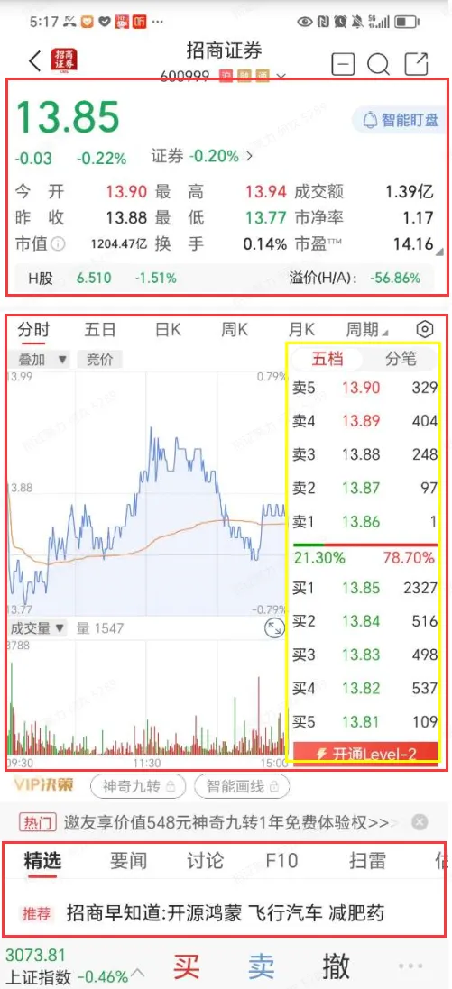 点击分时,就会呈现这只股票当日从早开市到下午收市期间的股价轨迹,右侧还能看到五档行情信息(黄色框内),也就是当前时刻,想买的人愿意出的最高的5个价位和卖家里愿意给出的最低的5个价位,以及对应报价的待成交单数(如果开通LEVEL2十档行情的话,就可以看到10个档位更细腻的买卖报价信息啦);