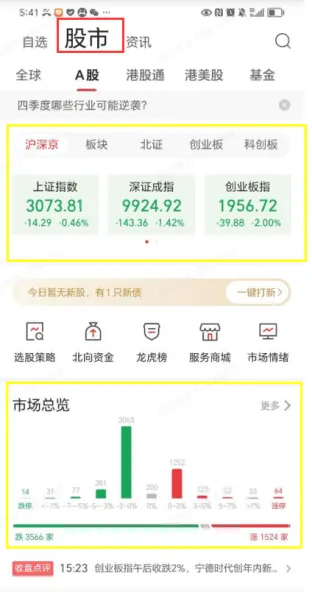 在这里就可以看到上证指数、深证成指、创业板指、沪深300、科创50等主要大盘指数的点数及当日涨跌幅,这几个就代表了A股整体大盘的涨跌情况,红色说明当日是上涨的,绿色就说明下跌了,只不过每一个指数代表的含义不太一样,比如上证指数代表了上交所的股票的总体走势,深证成指代表深交所的股票走势......(备注:我国大陆有3个证券交易所,上海证券交易所、深圳证券交易所和北京证券交易所,在大陆范围内,一只股票只能在上海证券市场、深证证券市场和北京证券交易所选择其中一个上市,不能在多个交易所同时上市)......