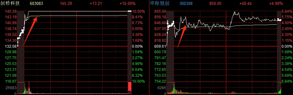 昨日市场反弹,趋势大成交修复,今早开盘,在昨夜美股光通信大涨及中际旭创超预期业绩的催化下,AI硬件继续走强,天通股份大单一字,剑桥科技等首板,权重中际旭创、新易盛等大涨再创历史新高,盘中源杰科技股价超越贵州茅台。