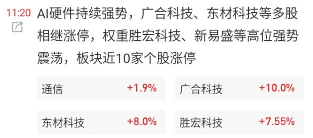 盘中科技权重胜宏科技、新易盛等延续强势,又有AI硬件广合科技、东材科技等多股相继涨停,创业板指午间收盘前再创新高。