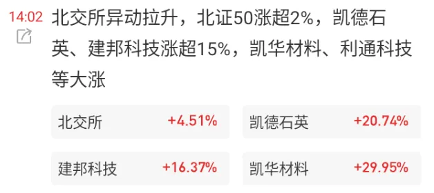 两点左右,北交所异动拉升(小作文传北交所基金预期下周放开申购上限),凯德石英、建邦科技等大涨。