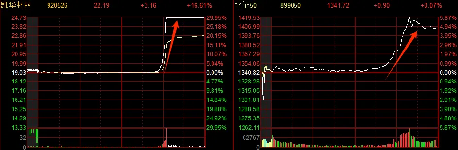 随后北证50涨幅持续扩大,凯华材料、创达新材30cm涨停,凯德石英涨超20%,纳科诺尔、天马新材等多股大涨。