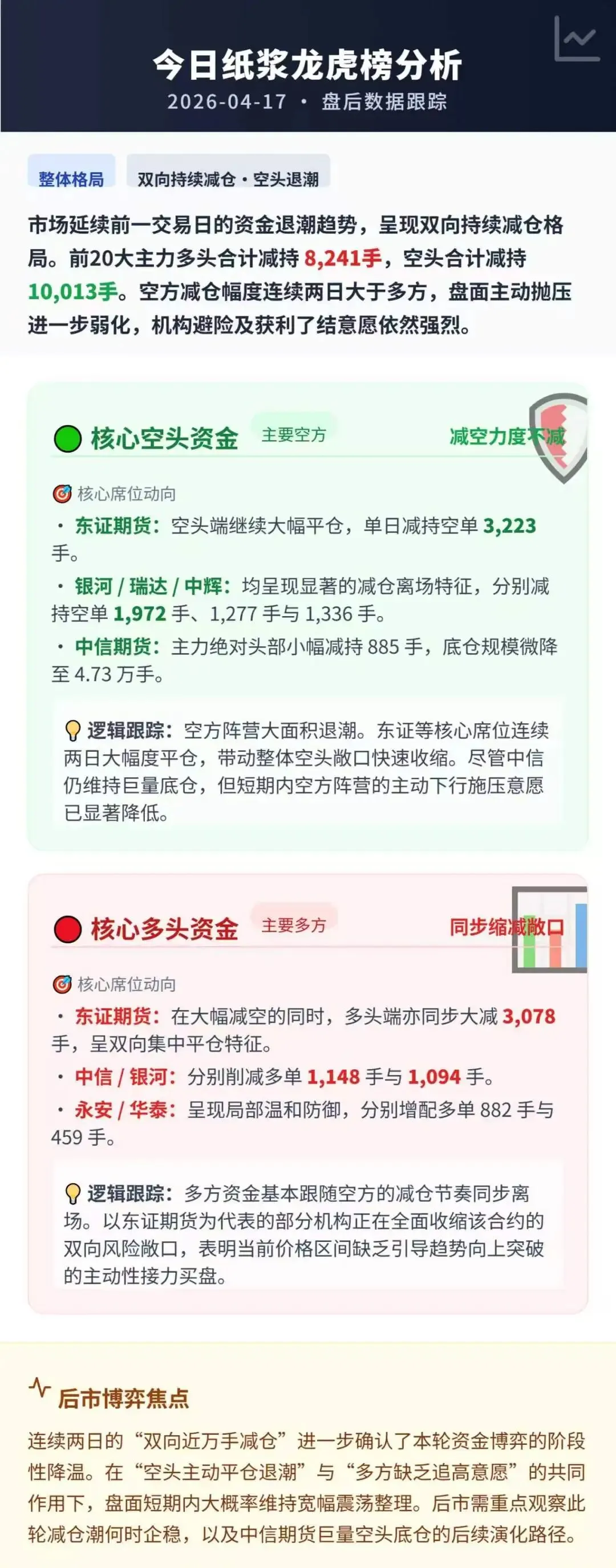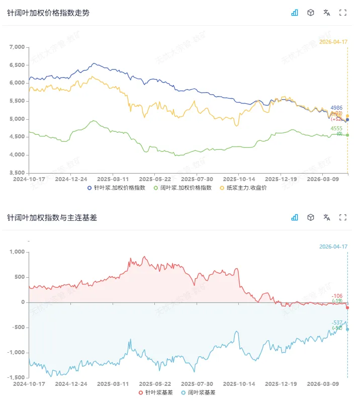 市场摘要:今日纸浆SP05合约区间震荡,针叶青岛银星基差05+40附近,常熟银星基差05+110附近,针叶基差走强,成交受限。阔叶浆报价维持4580附近,成交清淡。期货端市场延续前一交易日的资金退潮趋势,呈现双向持续减仓格局。