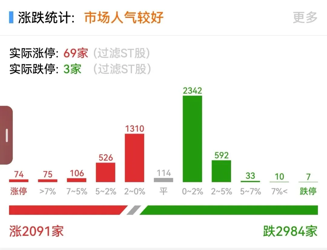 行业板块涨跌互现,非金属材料、电子化学品、元件、通信设备、塑料、电池板块涨幅居前,旅游景区、酒店餐饮、医疗服务、医药商业板块跌幅居前。上涨股票数量接近2100只,近70只股票涨停。光模块概念股爆发,多股涨停。PCB概念延续强势,一只个股涨停创历史新高。液冷服务器概念持续活跃,多股涨停。算力租赁概念再度走强,某股4天3板续创历史新高,另有二股涨停。下跌股票近3000只,3只股票跌停。