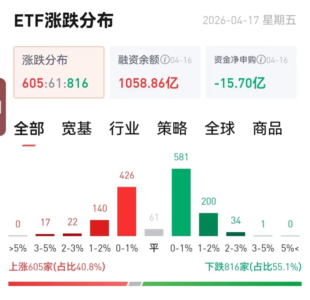 ETF上涨的605只,816只下跌,昨日融资余额1058.86亿,昨日净赎回15.70亿,有资金出逃迹象,需要关注下周的情况。