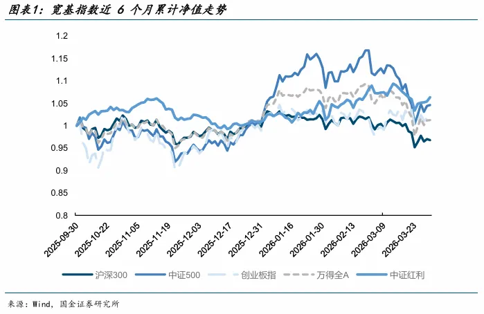 2025年四季度以来,A股市场运行并未呈现出一致的趋势性上行特征,而是表现为震荡运行与结构分化并存。从宽基指数累计净值走势来看,万得全A整体呈现缓慢抬升,但过程中多次出现回撤;沪深300走势相对平缓,缺乏持续向上动能;中证500虽在阶段性表现较强,但波动显著更高;创业板指则体现出更高弹性与更频繁的回撤。不同指数之间并未形成稳定的强弱关系,而是多次出现相对优势切换,说明市场缺乏统一主线,更接近震荡环境中的结构性行情。