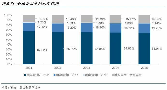 从需求结构来看,电力消费的多元化进一步强化了行业稳定性。第二产业长期占据用电主体地位,构成需求基本盘;同时,第三产业与居民生活用电占比持续提升,使电力需求逐步由“工业驱动”向“多元驱动”转变。这意味着电力需求同时嵌入工业生产、服务业运行与居民生活等多个场景,覆盖范围越广,对单一经济链条波动的敏感度就越低,从而在宏观环境变化中保持更强的韧性。