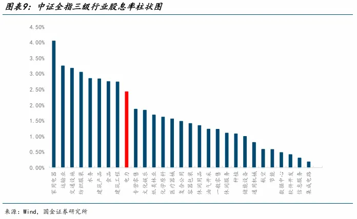 从行业对比来看,这一特征亦可以得到直观印证。以股息率分布为例,电力行业整体处于市场中上水平,并非极致高分红,但其收益特征呈现出明显的“稳定而非极端”特征,体现出与传统高股息行业不同的收益结构——其分红更多建立在稳健现金流之上,而非周期性利润波动。