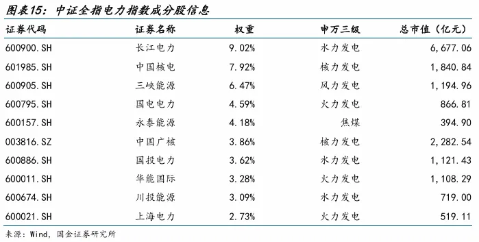 中证全指电力公用事业指数的成分股主要集中在电力生产与供应及公用事业服务两大板块。截至4月1日,权重最高的五家公司分别为:长江电力(600900.SH)9.02%、中国核电(601985.SH)7.92%、三峡能源(600905.SH)6.47%、国电电力(600795.SH)4.59%及永泰能源(600157.SH)4.18%。这些企业多为大型国有控股企业,代表了行业龙头地位,同时自由流通市值较高,保证了指数的流动性与代表性。
