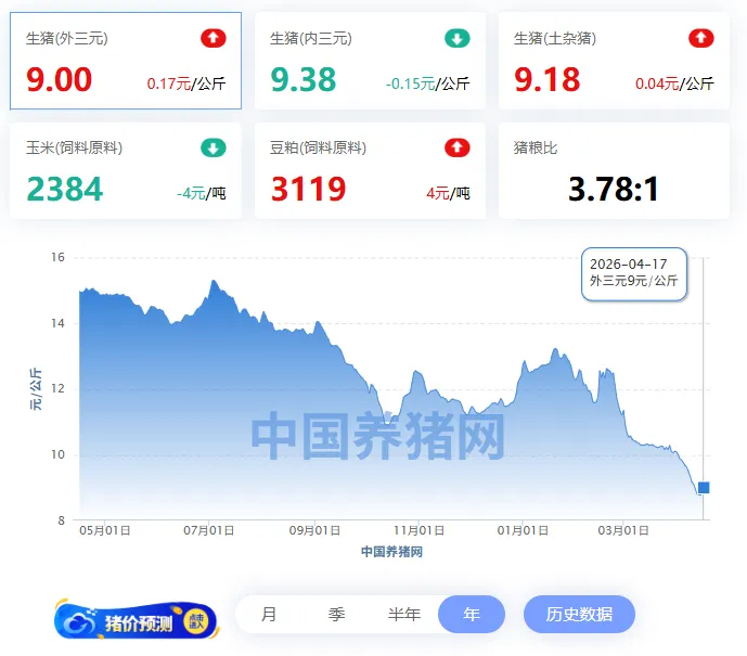 2026年4月17日全国外三元均价9.00元/公斤,今日猪价较昨日报价上涨了0.17元/公斤。