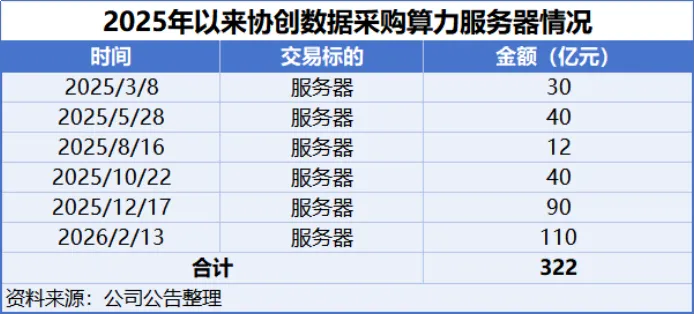 2025年以来,协创数据共发布6次公告,向多名供应商采购服务器,且金额越来越大,合计金额不超过322亿元。最近的一笔交易在2026年2月,金额高达110亿元。