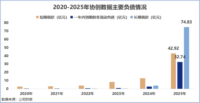 具体来看,2025年协创数据的短期借款、一年内到期的非流动负债、长期借款均出现了大幅上升,金额分别为42.92亿元、32.74亿元、74.83亿元。