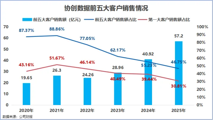 2020-2025年,协创数据的前五大客户销售额从19.65亿元上升至57.2亿元,收入占比反而从83.37%下降至46.75%,尤其是第一大客户收入占比从43.16%下降至30.81%。