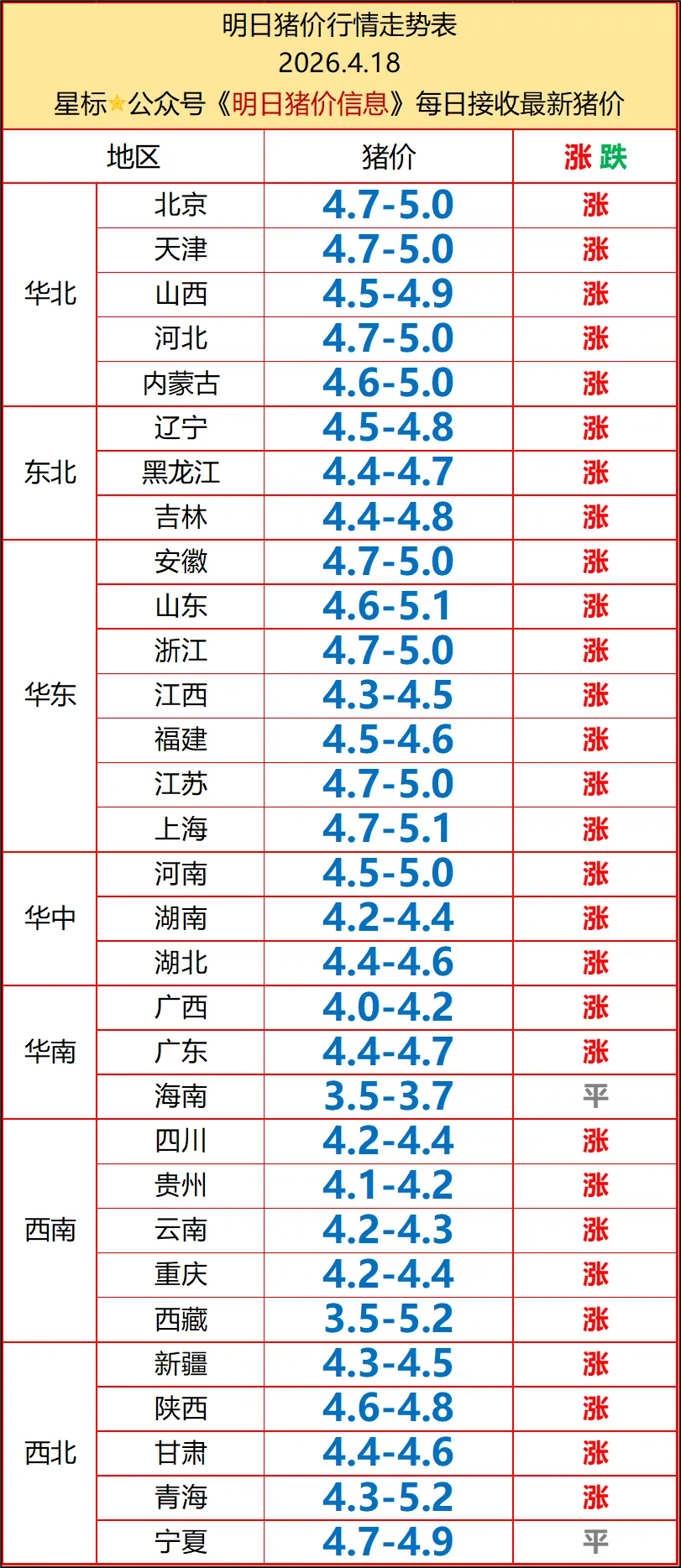 4 月 18 日全国猪价整体稳中偏强,小幅上涨。北方主产区涨势明显,养殖端惜售挺价情绪较浓,叠加屠企节前备货、二次育肥进场,对猪价形成支撑。南方多地同步企稳补涨,仅个别区域小幅波动。当前生猪供应依旧充足,猪价上涨空间有限,预计以窄幅震荡上行、温和反弹为主。