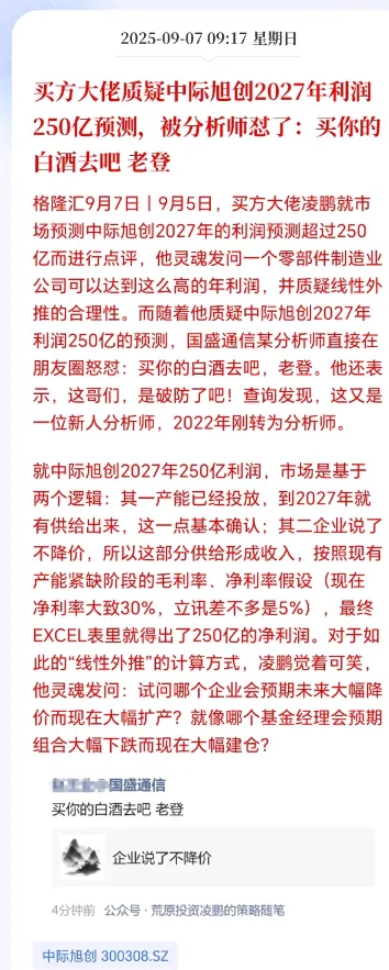 去年9月5日,新老分析师隔空论战,新派分析师预测中际旭创2027年净利润能超250亿,老派分析师认为总归是制造业,哪能不考虑未来的降价,利润不可能这么夸张,新派分析师怒喷“买你的白酒去吧,老登”。