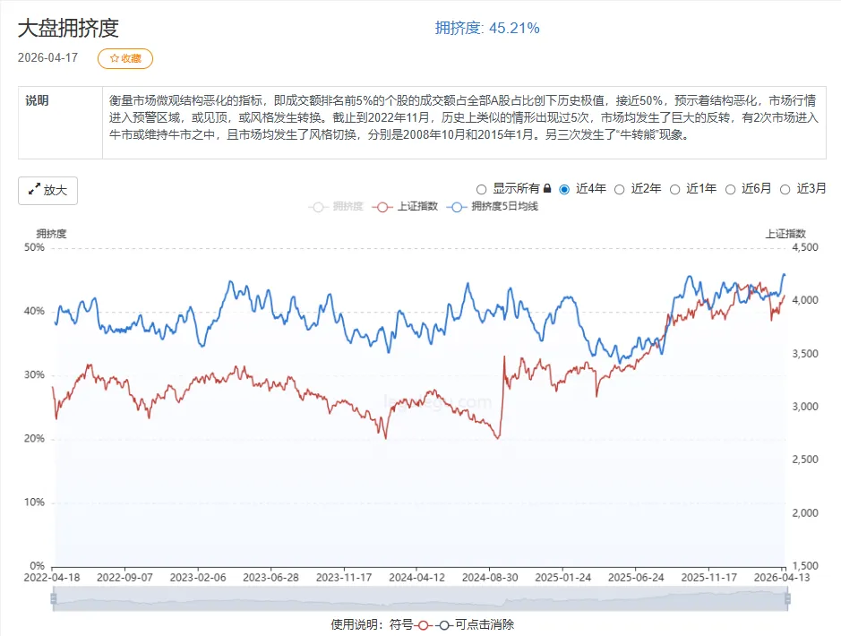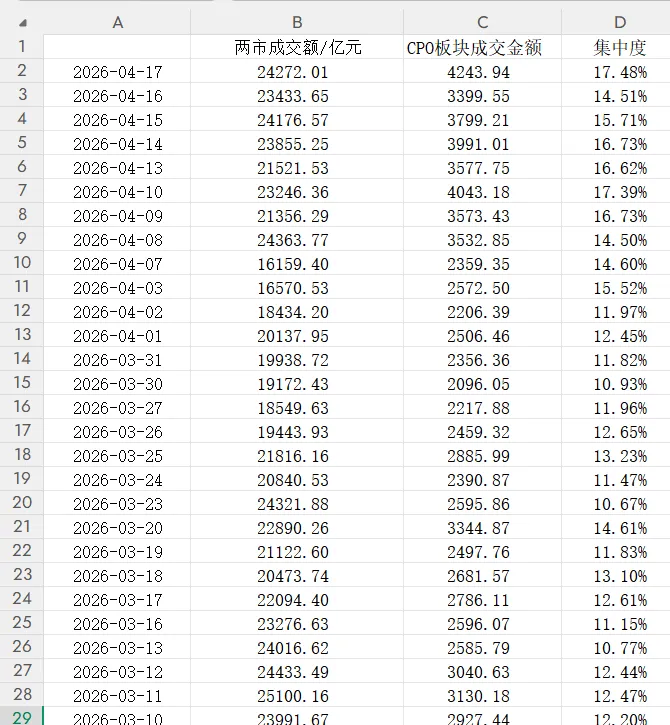 今天CPO板块成交4244亿,占两市总成交的17.48%,似乎还没到“单一板块占总成交20%”的魔咒,整体市场的拥挤度已经非常高了。
