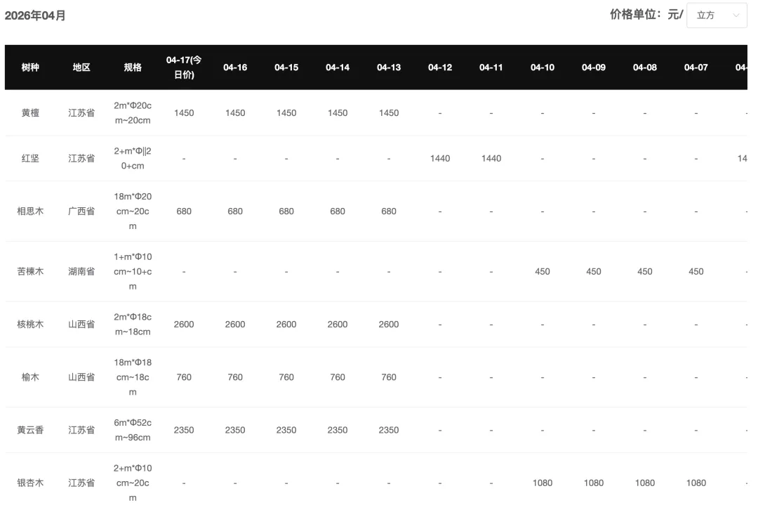 今日原木·硬杂木价格存在波动。其中采木网平台合作报价商——河南榆木原木直径18厘米以上、2米以上的家具级榆木原木,价格大约在1400元/m³左右。目前国内外的经济环境、行业政策以及季节性需求变化都可能对原木价格产生影响。【获取今日报价商联系方式或加入采木网报价吸引更多客户,请联系13373610205(微信同号)】