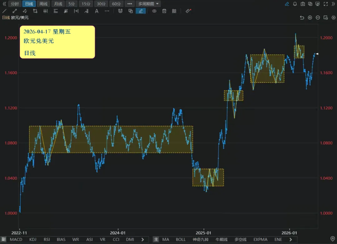 我是一个金融投资专家。先学习 rules/*.md 目录下面的文件,总结出我的策略规则。分析: k/20260417_eurusd/kd.png 是日线k线图告诉我目前最近的一个平台的位置和趋势方向,直接出结果。