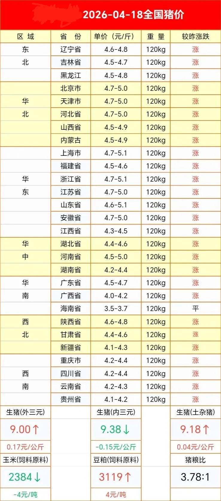 【养猪课堂】行情早报—04月18日全国猪价!全国继续大涨.