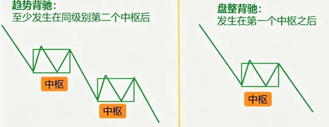 一旦标准的趋势背驰成立,最低保证是:价格一定会拉回最后一个中枢。比如上涨背驰,哪怕后续不直接反转成下跌趋势,也一定会跌回第二个横盘平台里,绝对不会只回调一点点就继续新高;下跌背驰,哪怕不直接反转成大牛市,也一定会反弹回最后一个下跌中枢里。这是缠论给你的确定性,也是你操作的安全边际。盘整背驰,就是只有 1 个中枢的走势里出现的背驰,它和趋势背驰的核心区别:①趋势背驰:大概率引发同级别及以上的趋势反转,是大级别抄底逃顶的信号;②盘整背驰:90% 的情况,只是引发价格重新回到中枢里,做中枢震荡,不会引发大趋势反转,只适合中枢内的高抛低吸,新手对中枢震荡把握不好,很容易来回止损。新手要注意,MACD背离跟缠论背驰是两码事,完全的两码事儿,缠论是裸K,裸K一定比指标走的快!
