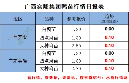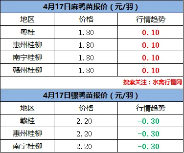 4月18日:桂柳农牧报价保持稳定,山东种鸭联盟报价保持稳定,主产区主流报价区间1.35-1.45元/枚。