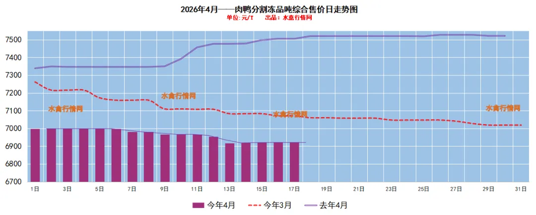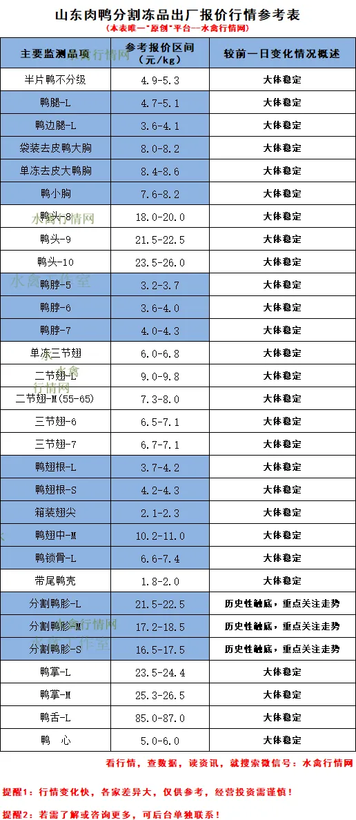 截至今天,边腿/鸭腿正常3.8/4.8上下,高点4.0/5.0,低点3.5/4.5;单冻鸭胸目前正常报价8.3-8.5上下,低点8.2上下,高点8.6;鸭胗M正常17.0-18.2区间上下,高点18.5上下;鸭胗S高点17.7上下,正常价格基本在16.8-17.5上下,低点16.3;5脖正常3.5-3.7上下,高点3.9;二节翅L正常9.1-9.5上下,高点9.8;二节翅M正常7.3-7.6上下,高点7.9,低点7.0上下;鸭翅根L高点4.3,正常3.8-4.0区间上下;鸭锁骨正常报价7.0-7.4上下,低点6.6上下;鸭头8低点在18.5上下,正常19.0-20.0区间上下。