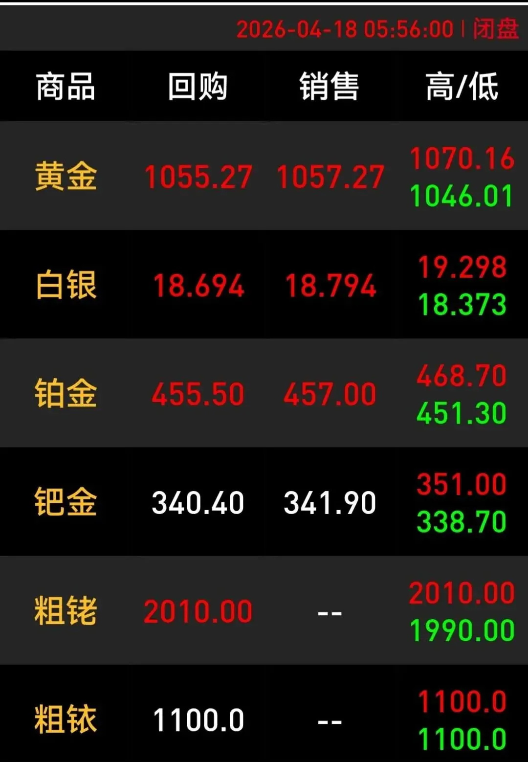 品种回购价销售价日内最高价日内最低价黄金1055.271057.271070.161046.01白银18.69418.79419.29818.373铂金455.50457.00468.70451.30钯金340.40341.90351.00338.70粗铑2010.00--2010.001990.00粗铱1100.00--1100.001100.00注:以上为融通金实物行情,单位为元/克(铑、铑除外),仅供参考,具体以实时交易为准。