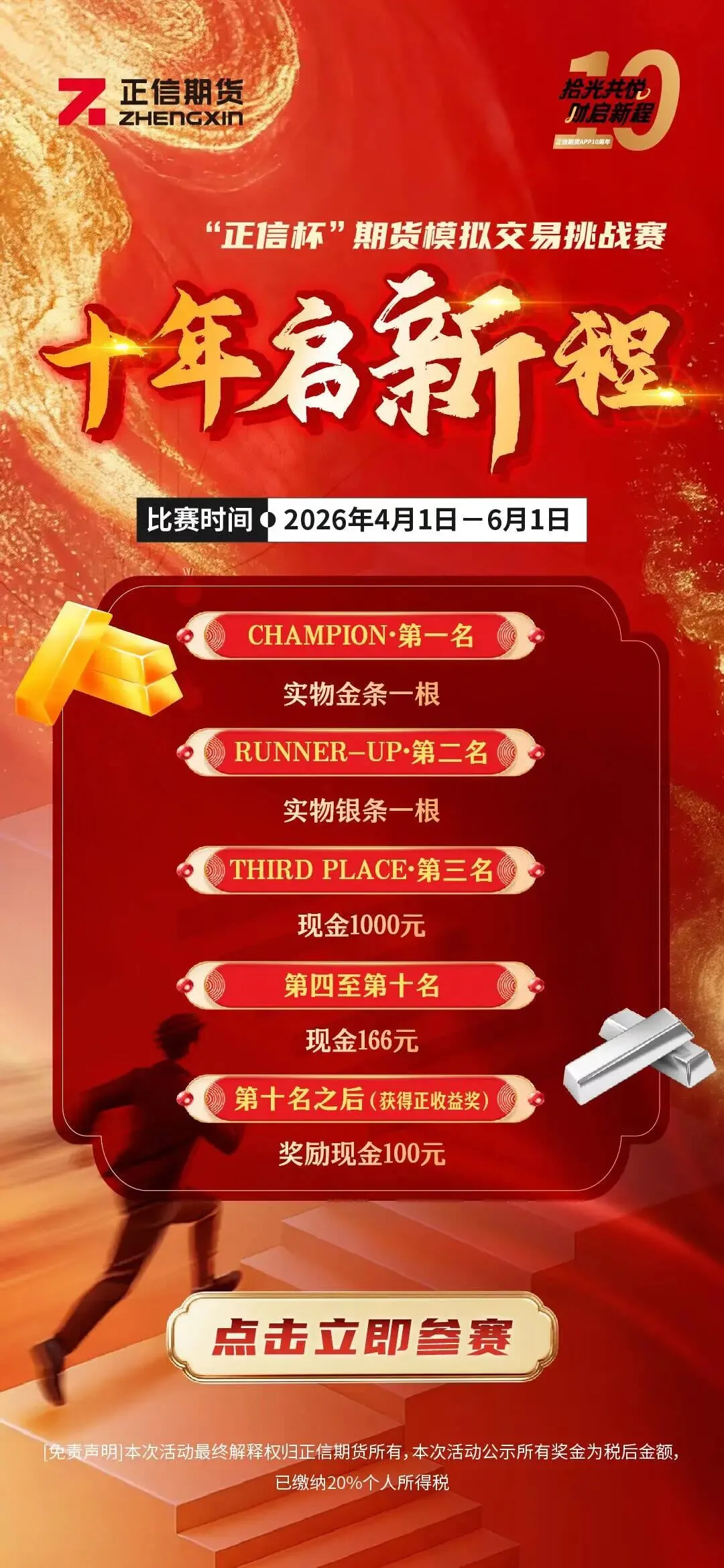 在本次比赛中获奖选手兑换奖品,需满足以下条件:①2026年4月1日至7月1日在正信期货开设实盘交易账户;②休眠用户需在上述时间内完成一笔实盘交易,或推荐一位朋友成为新用户;③获得前三名的账户,需要有一笔入金交易,同一账号只能领奖一次;④所有奖项都不可重复兑奖,每人仅可领取一项。