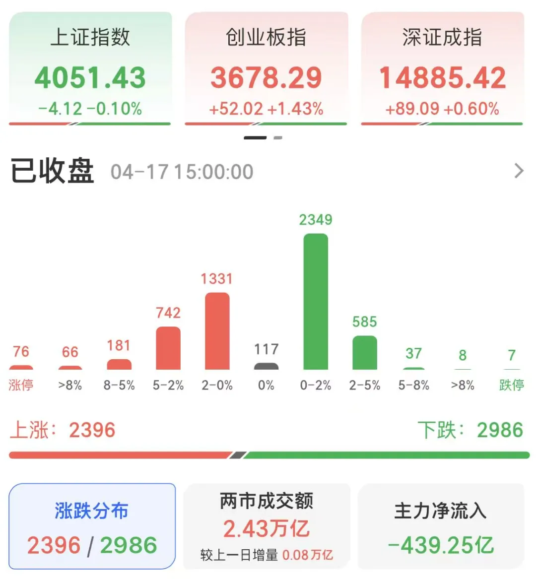 今日A股市场呈现指数分化、个股普跌的结构性行情。截至收盘,上证指数微跌0.10%;深证成指上涨0.60%;创业板指表现强势,上涨1.43%。两市成交额约2.43万亿元,较昨日小幅缩量。个股分化显著,全天上涨个股2396家,下跌个股2986家。