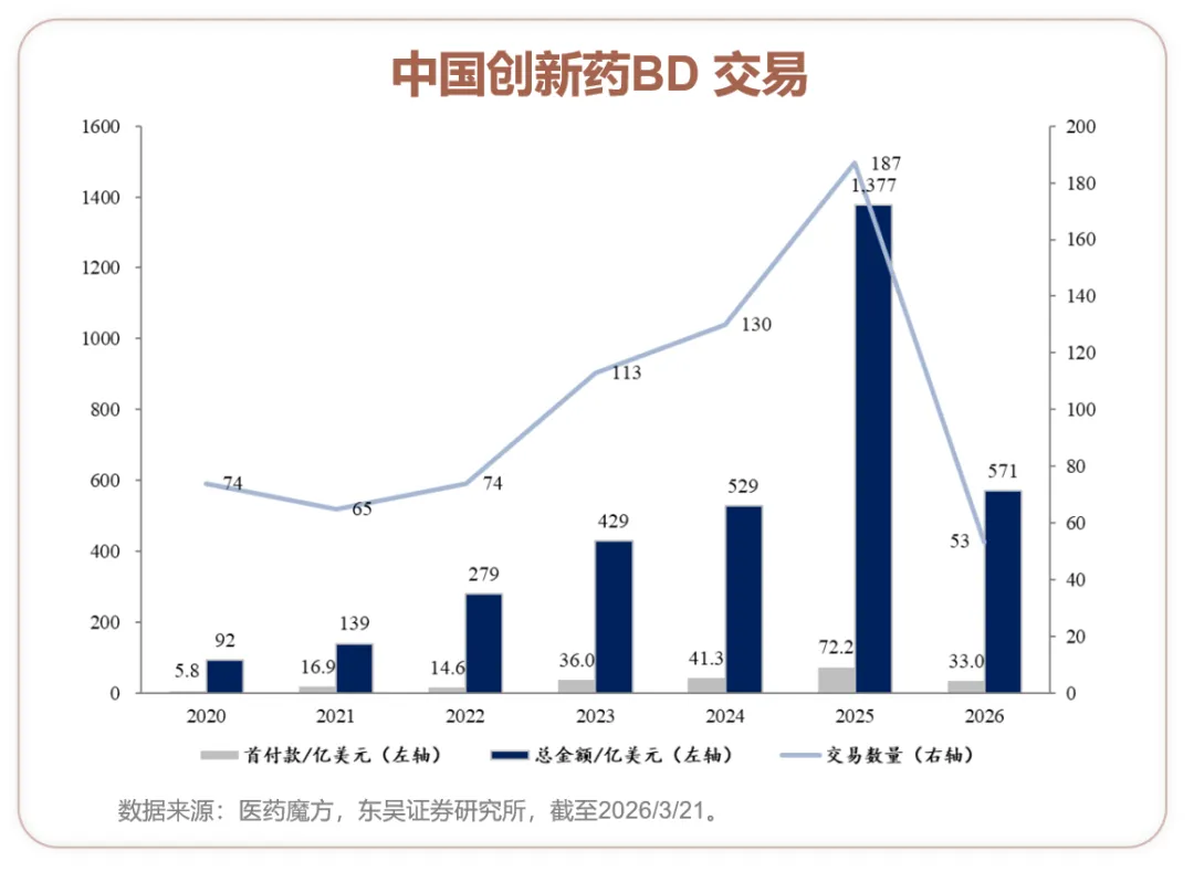 截至2026/3/21,中国创新药出海BD数量达到53项,首付款总额33亿美元,交易总金额571亿美元,占2025全年41%,超过2024全年总额。BD出海进展超出市场此前预期,展现出更强的延续性。