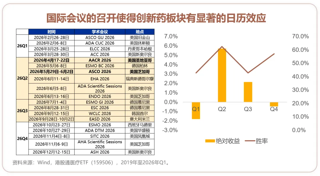 历年二季度是创新药行业大会密集周期,板块存在日历效应。2026年4月、5月分别是AACR、ASCO会议节点,二者与ESMO共同构成全球肿瘤领域三大顶级会议。