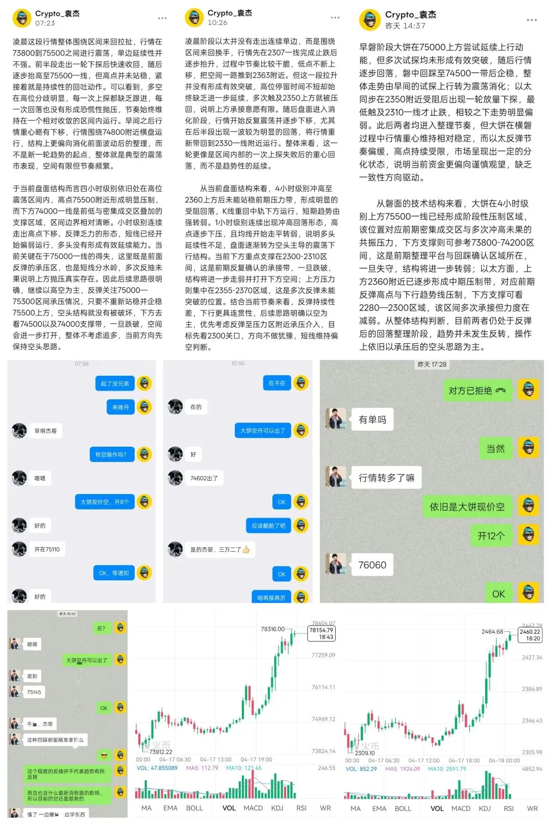 日内整体的行情节奏目前而言已经非常清晰:白磐震荡偏弱,晚间情绪反转走强。早间大饼自73800一线反抽至75000附近后,多次上攻无果,上方抛压明显,磐面始终处于冲高受阻、重心下移的结构中,这种环境下顺势去做空,抓的就是回踩释放空间,日内回落至74500下方这一段,空丹是完全有利闰空间的。而目前来看白磐的下跌并不是趋势转空,而是上涨前的洗磐与换手,这一点在午后低点不断抬高时就已经给出信号。真正的转折出现在晚间,美股开磐后风险情绪明显回暖,叠加市场对地缘局势缓和的预期升温,资金重新回流风险资产,同时前期高位堆积的空丹在突破关键压制后被集中止损,形成被动买磐推动,这才是大饼快速拉升至78000上方、以太强势突破2450的核心原因。也正因为看清了这一点,晚间顺势跟多同样拿到延续空间,日内多空两端节奏全部踩中,利闰自然不会少。说白了,这个市场从来不奖励猜测,只奖励看懂结构还敢执行的人,你赚到的钱,本质上是你认知兑现的结果。