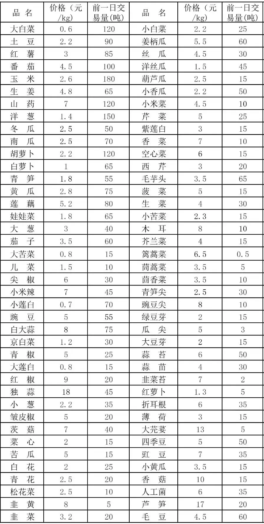 昆明王旗营蔬菜批发市场价格(元/公斤、吨)
