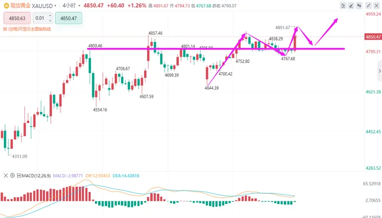 技术面,日线级别上行通道未被破坏,5日、10日、20日均线形成多头排列,中期趋势仍偏多。但4870-4890美元区间存在强阻力,多次冲高未果,说明多头进攻力度衰减。若突破该区间,上方目标看4910-5000美元;若回落,20日均线4650美元附近构成强支撑。4小时级别布林带收口,K线运行于中轨附近,MACD红柱缩短,RSI中性偏空,短线震荡格局明显。需关注布林带上轨4865-4870美元与下轨4765-50美元的突破情况,放量突破上轨则重启涨势,跌破下轨则开启回调。小时图均线交叉向下,K线连阴下跌形成包阳之势,运行结构重心偏下倾,由于大趋势偏多运行,回踩底部可以继续布局多单,下周上方强阻力4870-4890,突破则打开4900-4950的空间。下方支撑4800美元,若跌破该位置,或测试4750美元强支撑,日内策略回落逢低多。