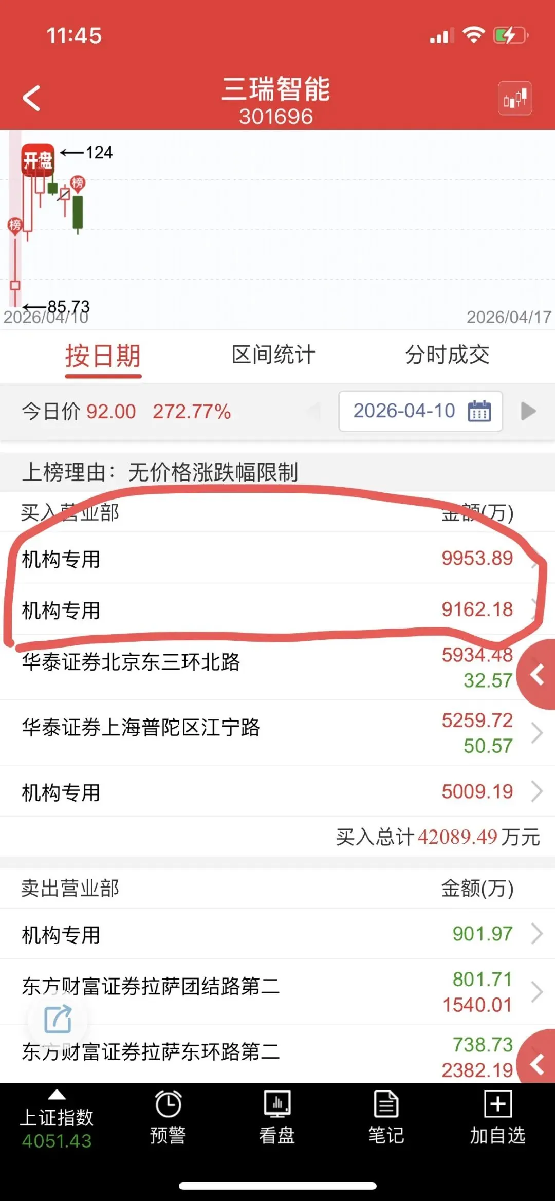 所以,如果没有4.10机构单买入三瑞智能,4.13三瑞智能大涨,泰金新能+红板科技后面也难有这么好的表现。(这个是属于偶然性,恰好遇上三瑞智能大涨带动)