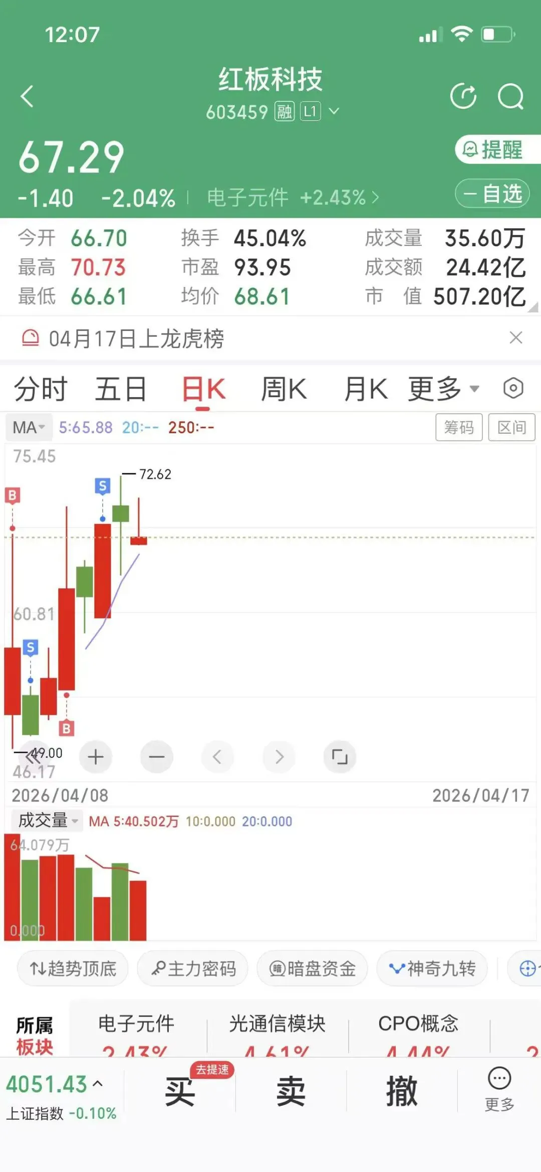 红板科技,4月9日卖,4月13日买,4月15日涨停板打开卖(因为这里它的出c涨停也是模仿,高度有限),大普微,大市值+模仿三瑞智能(龙虎榜机构买入),所以昨天开盘高开7个点附近,往往是卖点。