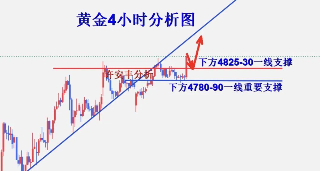 本周市场最引人注目的事件莫过于中东局势的戏剧性变化。伊朗宣布在停火期间“完全开放”霍尔木兹海峡,美国总统特朗普也对此予以确认。按照传统教科书式的逻辑,这一消息应导致避险情绪降温,金价随油价一同下跌,周五金价最高到达4891.6附近位置,但是下方支撑比较坚挺,多头未失防线,上方压力4900一线关口位置,下方支撑首要支撑于4785-90附近,短线MACD红柱持续放量,多头有冲击4900关口的力量,等待调整后多头再进行新一轮的冲高,具体操作点位以老许实时布局为准!关注老许,带你走出操作困局!如果你目前操作不理想,希望许安丰能让你的投资少走弯路,欢迎前来沟通交流!