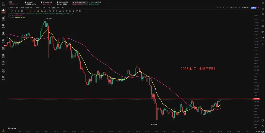我们看日线,日线级别今天破了一下76000,昨晚到了一下73000又拉上去,说明多头还有一点力量,按着这种趋势,到78000是不难的,78000附近可以正式步入空单了,75000,76000都可以陆陆续续进,也没几个点。这次横盘震荡时间长,不过也是最后一跌,横盘震荡2-3个月也是正常的,这次下去就是见底行情了。