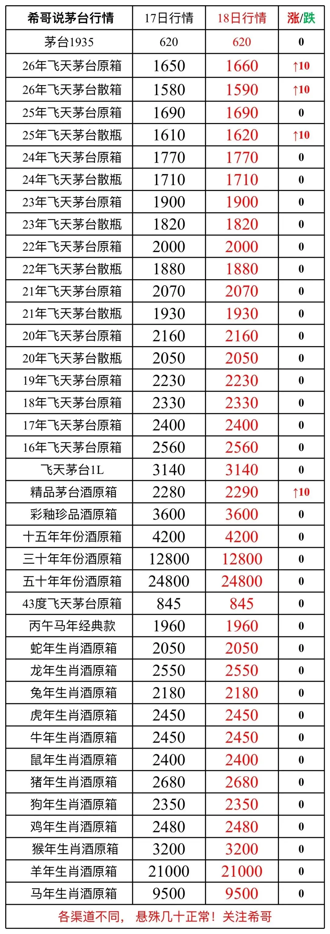 26年飞天茅台原箱:4月17日报1650元 → 4月18日1660元,上涨10元
