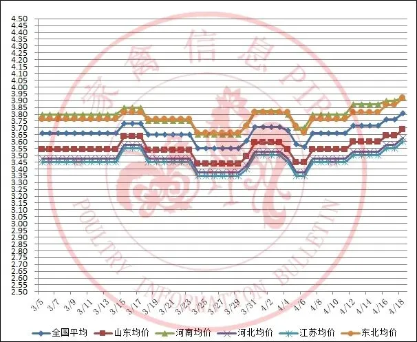 2026年3月5日-2026年4月18日主流地区白羽鸡毛鸡均价走势图