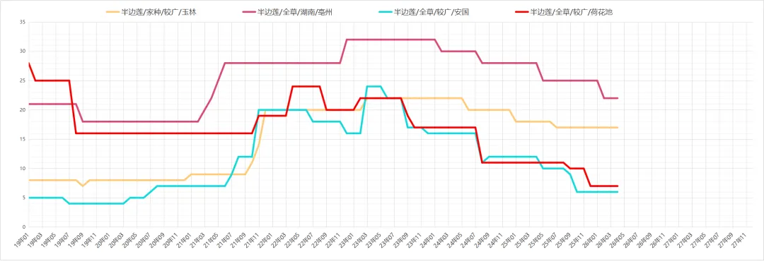 半边莲行情保持平稳,当前市场可供货源量充足,市场寻货商家多以按需采购为主,供需关系保持平衡,因缺乏较大的实际需求拉动,货源走销不快,现江苏家种货价格在7元上下。