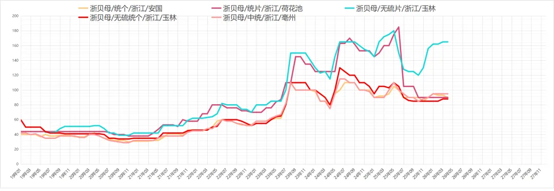 浙贝母目前价格坚挺,最近商家关注度提高,磐安集镇交易好于市场,现亳州市场无硫饮片多要价在150-160元之间不等,而个子报价在90元左右。