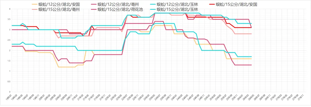 蜈蚣价微滑,正值产新,由于当前温度不高暂时产出的货量不多,五一假期前后便陆续进入大量产新阶段,现市场15公分左右的大条售价3.1-3.2元/ 条;13公分的中条2.3-2.4元/条,蜈蚣直皮1700元上下。